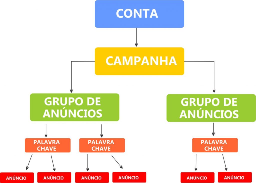 Dentro dos Grupos de Anúncios podemos visualizar as métricas destes grupos, como suas impressões, cliques, conversões, custo x conversão, dentre outras. Podemos aumentar ou diminuir os lances de CPC máximo a nível de Grupo, ativar ou pausar grupos e estes são responsáveis por deixar organizado dentro do AdWords os anúncios e palavras chave.